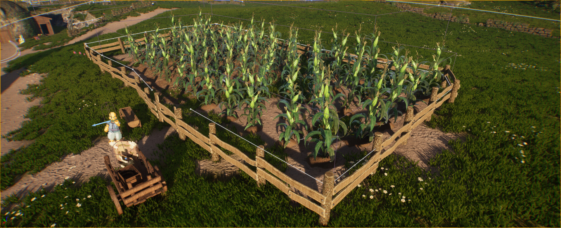 I started with the terrain. I created a tool with Houdini to make it possible to sculpt the base terrain in Maya/ZBrush and then import it to apply erosion. Using Houdini layers, I could apply materials afterward. I modeled the props using Maya and used Houdini for optimization and UVs. I used ZBrush for the terrain and also to create foliage. In Unreal, I used some procedural materials. The PCG was very cool; I could scatter grass, crops, and create stone and wooden fences. It wasn't an easy task to get the sprites working;